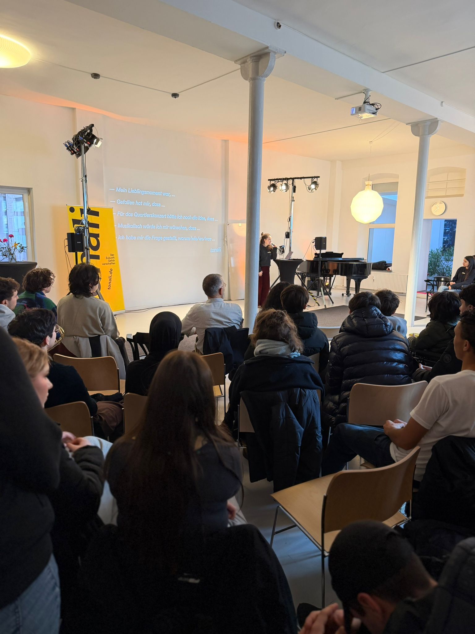 Johanna: Ja, klar, das mache ich gerne. Also bei uns dreht sich in der Publikumsakademie schwerpunktmäßig eigentlich alles um Jugendliche und das funktioniert so, dass wir in Kooperation mit Schulen aus Hamburg zusammenarbeiten und in Projekte starten, gemeinsam mit den Akademist*innen aus der Bühnenakademie, also denen, die hier ausgebildet werden sollen, um das klassische Konzert in der ursprünglichen Form auch zu hinterfragen. Die Jugendlichen haben dabei einerseits die Chance, Kulturmanagement-Funktionen zu übernehmen und andererseits sich auch künstlerisch auszuprobieren, ins künstlerische Denken und Handeln zu kommen und gemeinsam mit den Musiker*innen Konzerte zu gestalten, Formate zu gestalten.