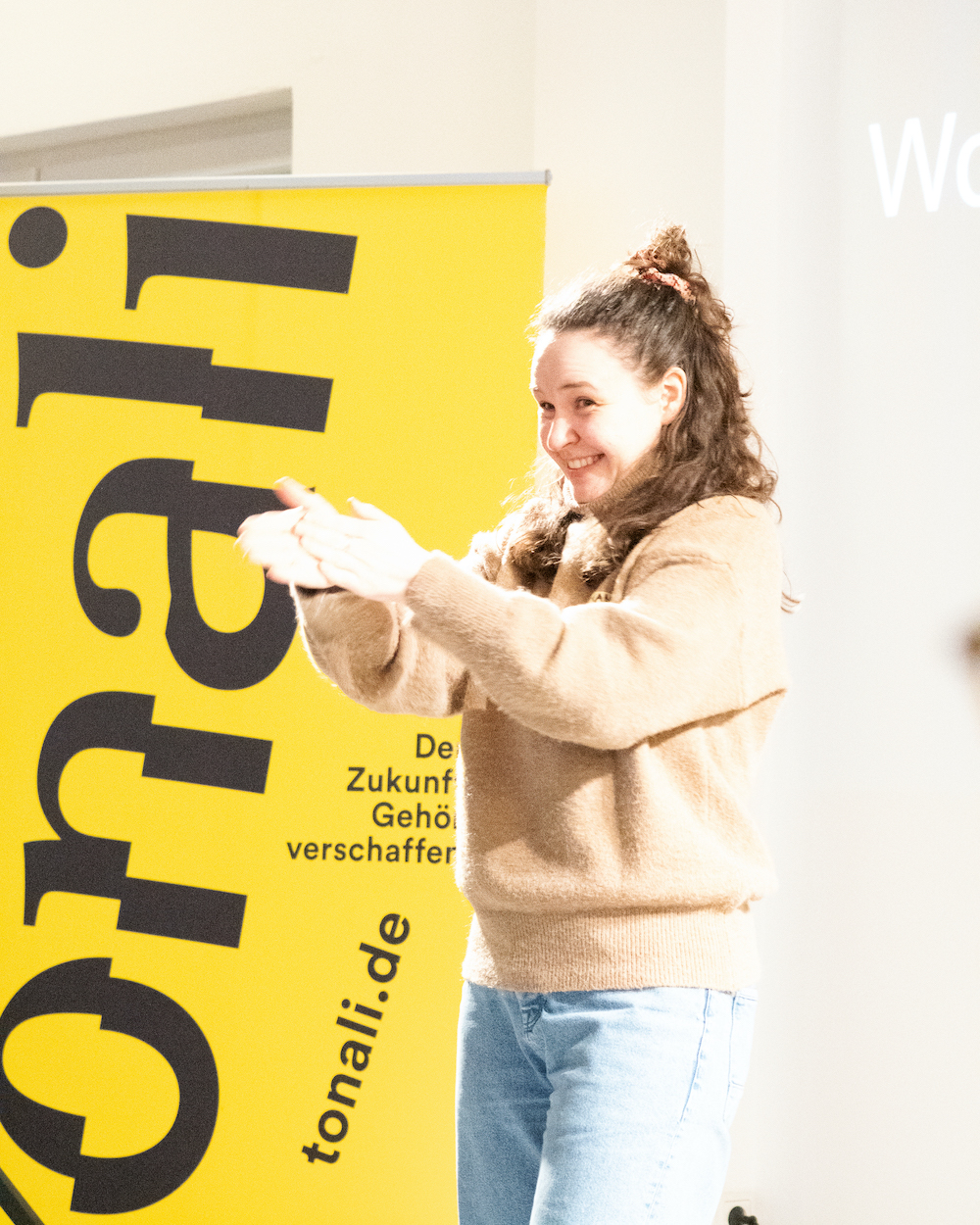 Johanna: Also das kann ganz unterschiedlich starten. In diesem Jahr, dadurch, dass wir die Kooperation mit euch haben und eurem tollen Format 1:1 CONCERTS, haben wir uns überlegt, wie das direkt mit einfließen kann. Das heißt, die Jugendlichen sind hier angekommen und die Akademist*innen waren schon vor Ort, die Musiker*innen. Die Jugendlichen wurden einzeln abgeholt vom TONALi-Team und von den Musiker*innen und in unseren Seminarraum geführt, einzeln. Und dort durften sie sich einen Platz suchen, der gegenüber war von einem anderen Platz. Also, es saßen sich am Ende immer zwei Personen gegenüber und sie hatten dann die Aufgabe, dieser fremden Person, der sie gegenüber saßen, eine Minute in die Augen zu schauen.