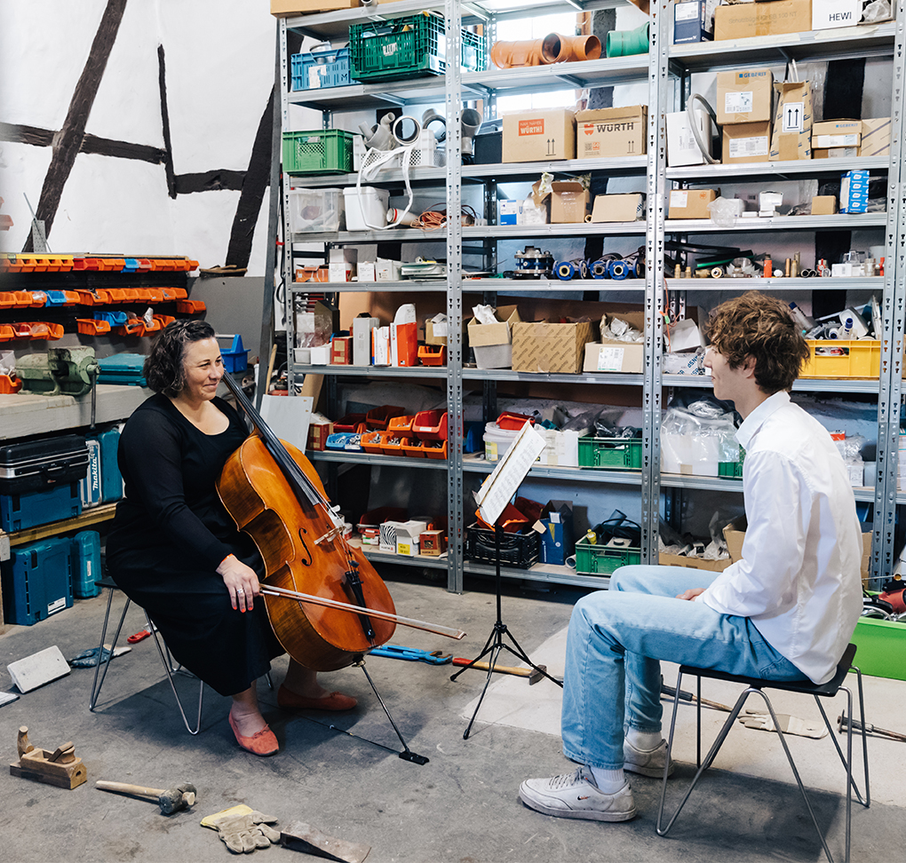 Anke Heyn, Cellistin der Staatskapelle Dresden und 1:1 Pionierin der ersten Stunde spielt in der Werkstatt des Klosters Volkenroda