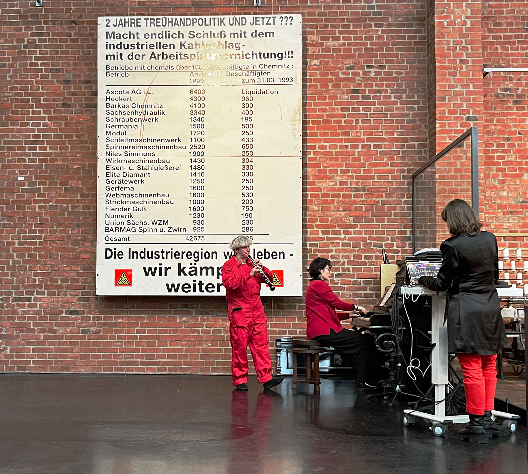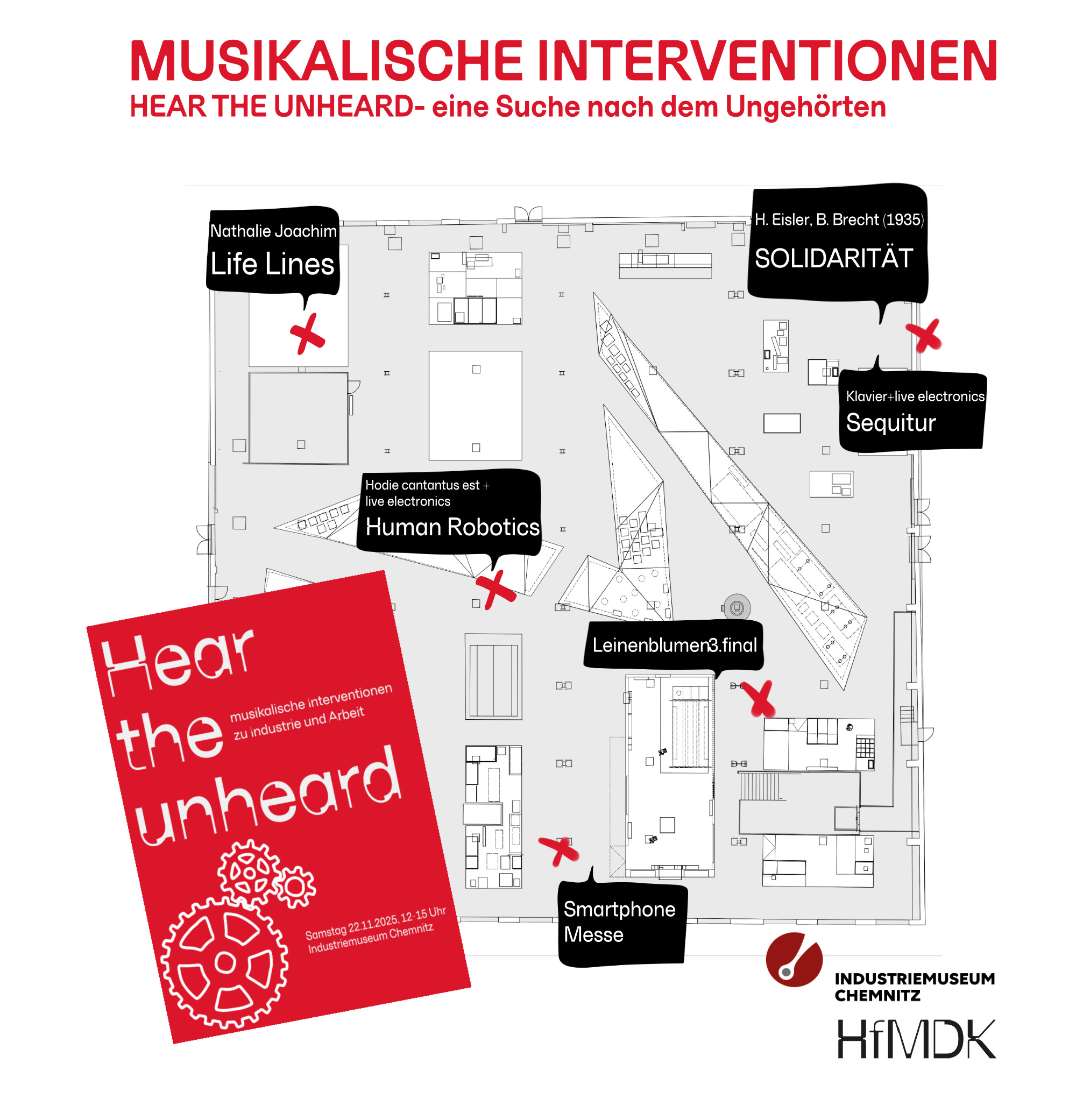 Dieses “Museums-Konzert” entstand unter Leitung von Franziska Ritter im Rahmen der Workshopreihe „Kuratieren in den Künsten“ des Instituts für zeitgenössische Musik IzM der Hochschule für Musik und Darstellende Kunst Frankfurt am Main (HfMDK) im Sommer- und Wintersemester 2025 in Kooperation mit dem Industriemuseum Chemnitz. Wir danken Jürgen Kabus, Romana Klose und dem großartigen Team des Industriemuseums fürs Ermöglichen dieses Experimentes.
