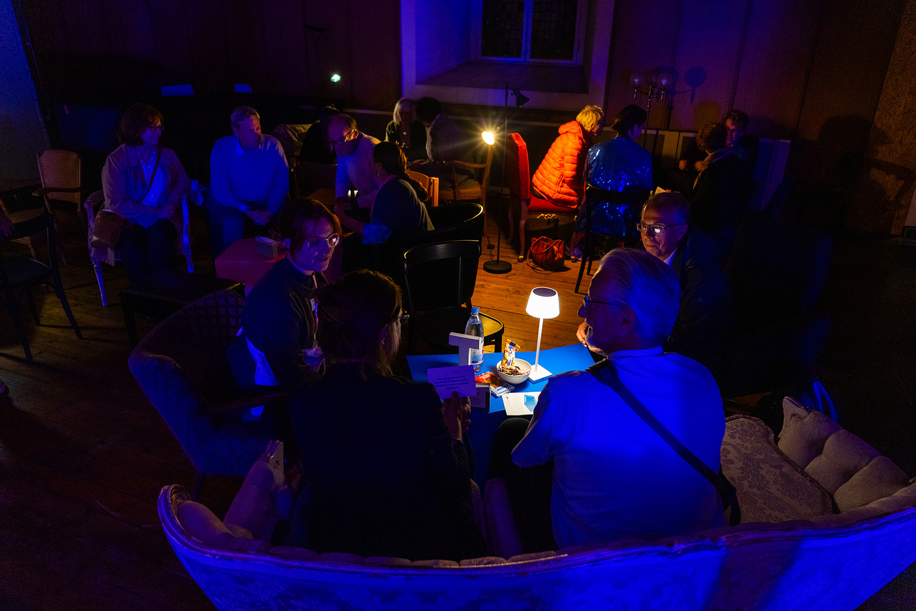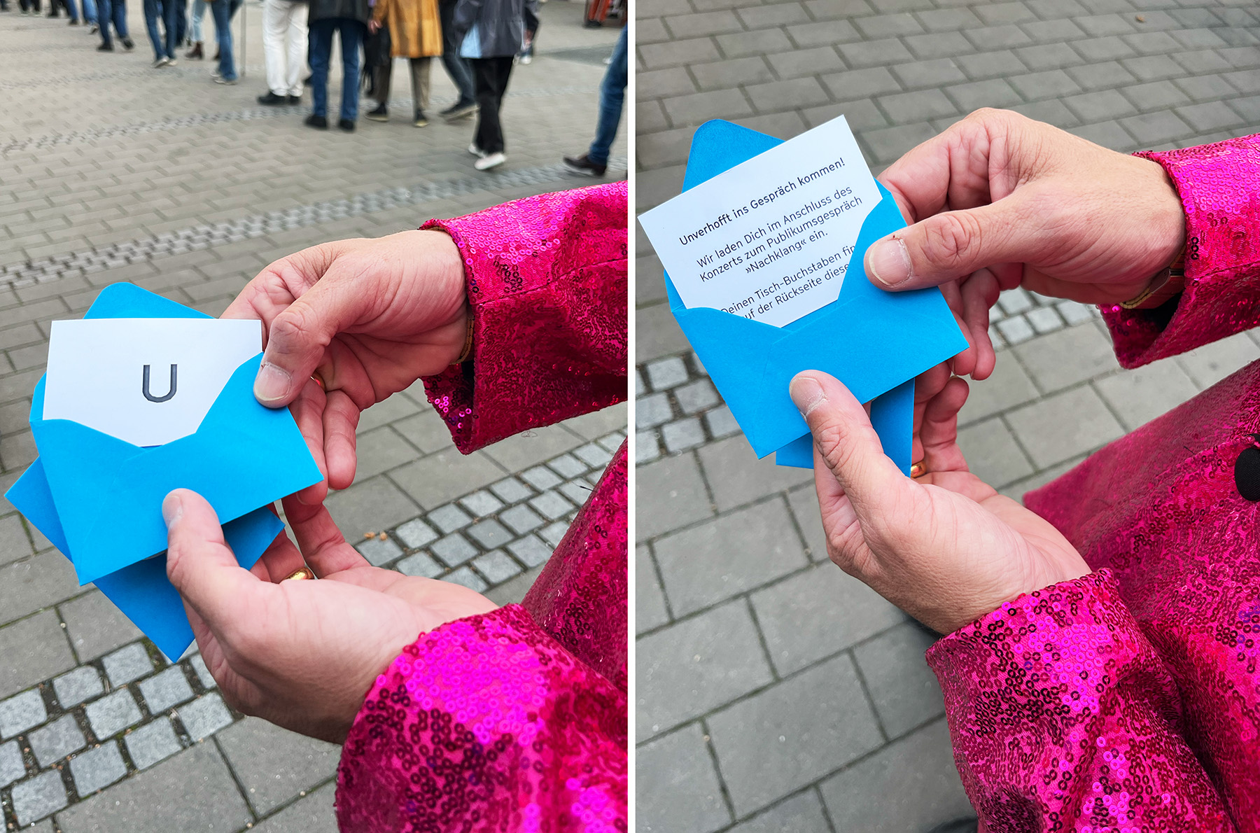 Dieses Concert Experience Design zielt darauf, den Austausch unter dem Publikum zu fördern. In kleinen, zufällig ausgelosten Gruppen kommen Konzertbesucher*innen unverhofft miteinander ins Gespräch und entdecken neue Perspektiven auf das musikalische Erlebnis des Abends.