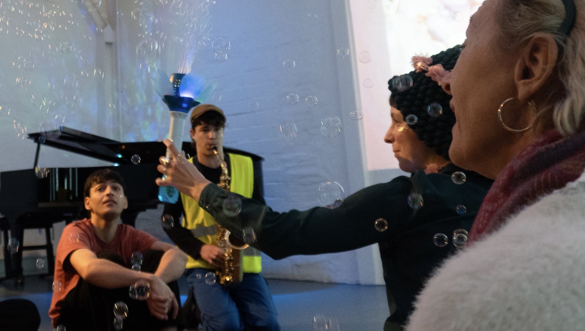 Der nächste Schritt war der Begegnung gewidmet: „15 Minuten für eine SYNTOPIE“. Je zwei Musiker:innen (die auch in dieser 2er-Konstellation während ihrer Ausbildung für je ein Hamburger Gebiet des sogenannten „Kunstschutzgebiets” künstlerische Interventionen entwickeln) bildeten ein Tandem aus ihren Topien, verbanden deren Visionen und entwickelten daraus eine musikalische Intervention, gewidmet einer Person dem „Kunstschutzgebiet“. Diese Miniaturen wurden am Freitag im TONALi‑Saal vorgestellt – begleitet von den Eingeladenen, dem TONALi‑Team und vielen neugierigen Zuhörer:innen. Dabei entstand ein vielgestaltiges Showing, das berührte: Klang wurde zu Geste, Musik zu Dialog, Utopie zu gelebter Realität. Zwischen stiller Achtsamkeit und spielerischem Erkunden eröffnete sich ein Resonanzraum aus Formaten und Experimenten, in dem aus individuellen Impulsen gemeinschaftliche Energie wuchs.