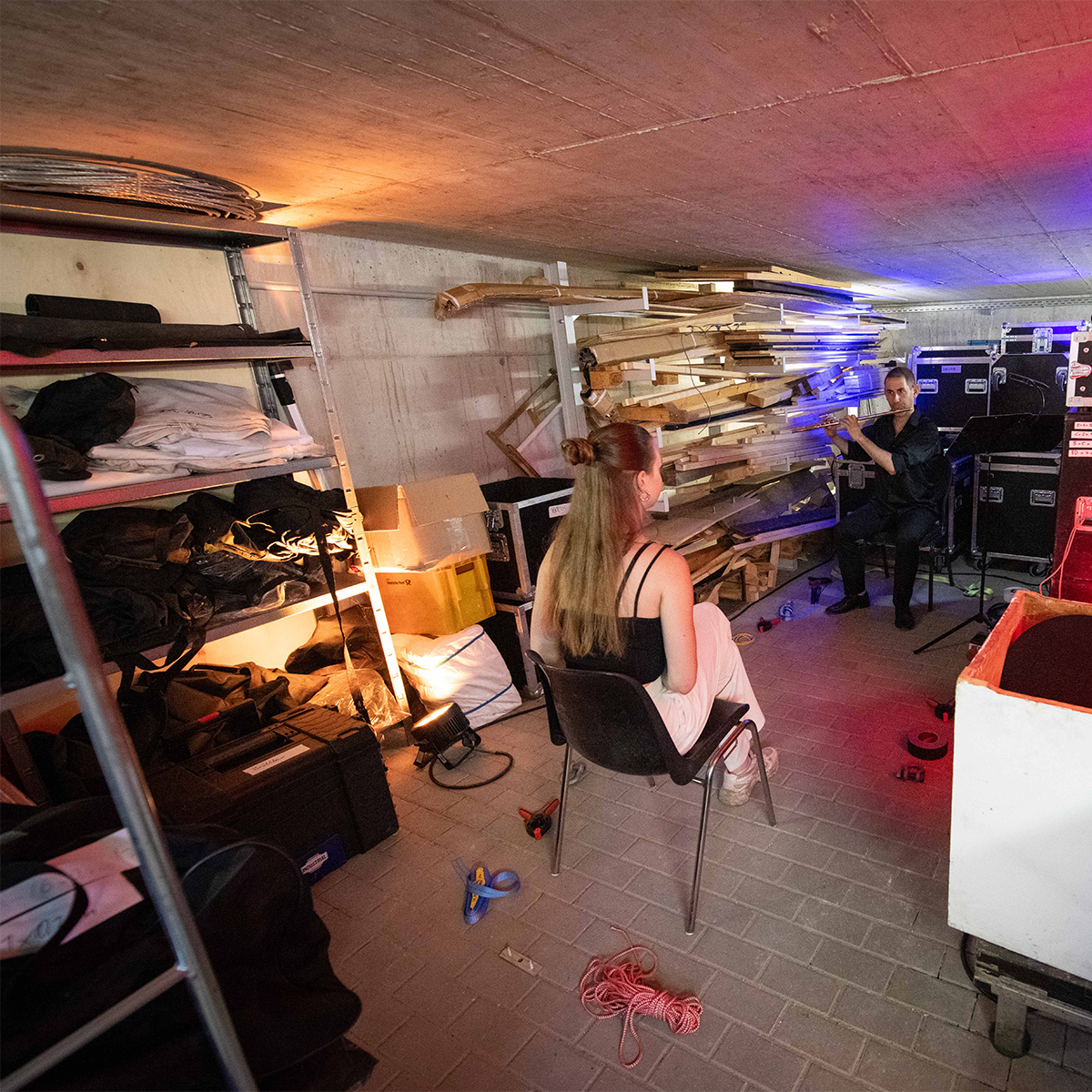Flötist Avner Geiger im Technikraum unter der Open-Air Bühne im Waschhaus Potsdam