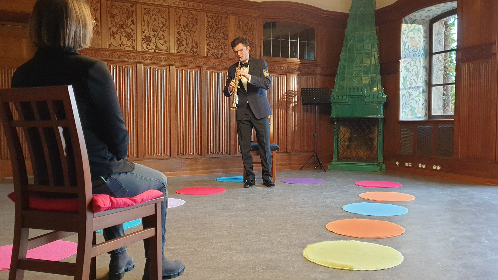 Sopransaxophonist Janez Ursej (Polizeiorchester Bayern) spielt im Kaminzimmer der Burg Schwaneck